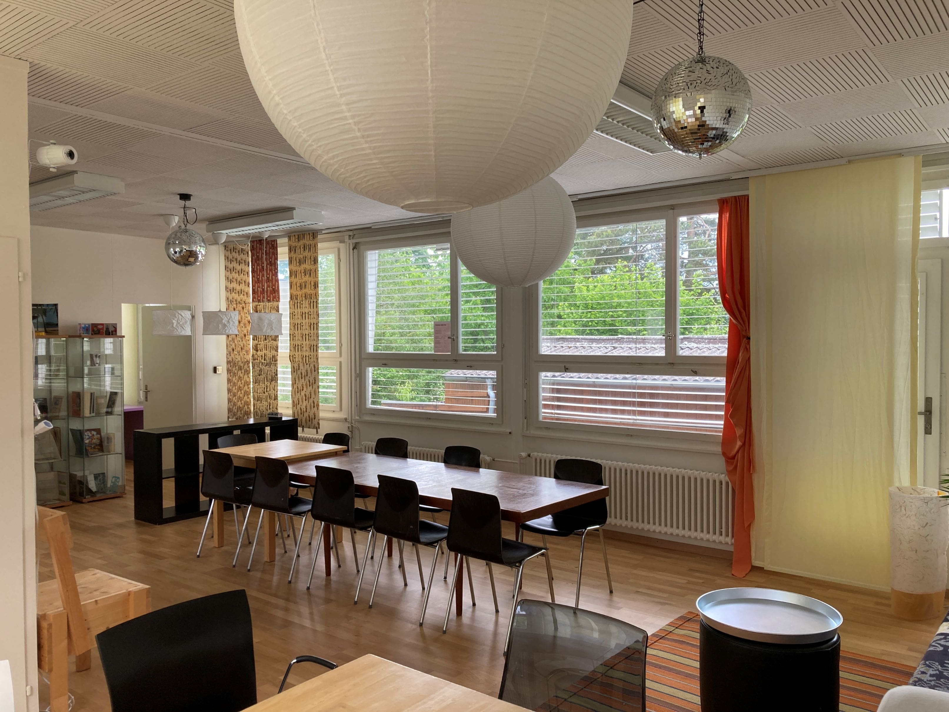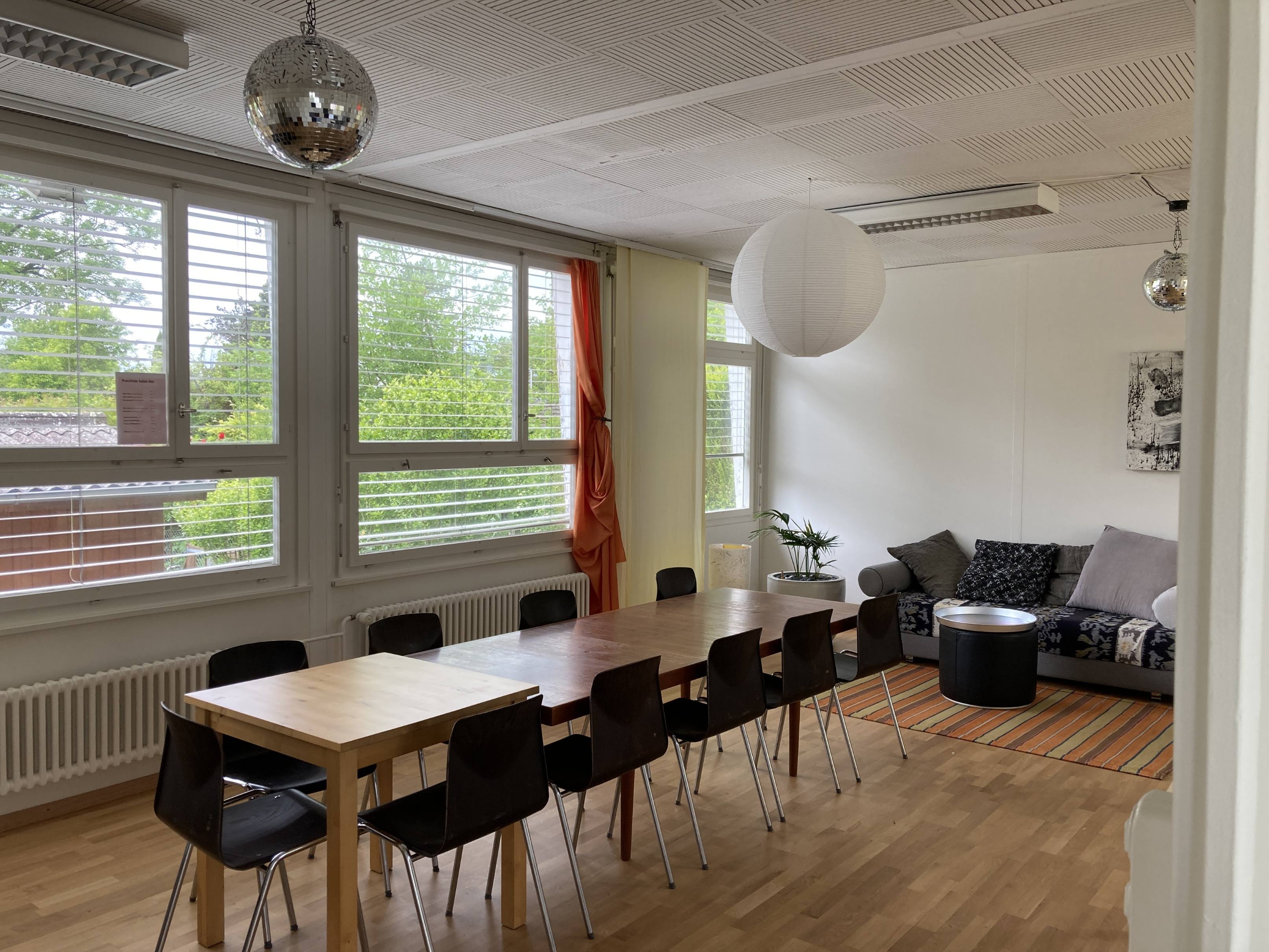 Der Pavillon West befindet sich im Grünen, gleich beim Bistro. Ein gemütlicher, kleiner, stiller Raum. Er verfügt über einen grossenTisch in der Mitte und Stühle sowie eine Liege. Der ideale Rückzugsort.